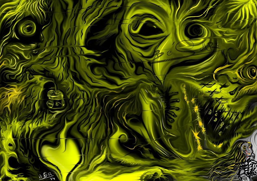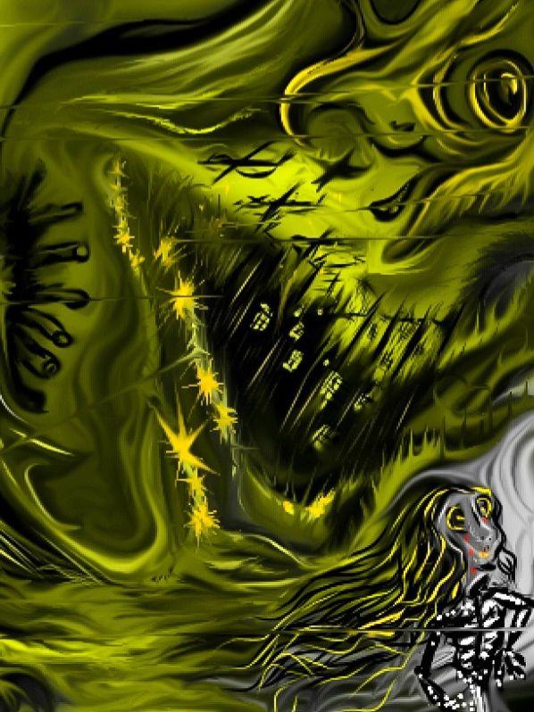 The little girl with skeleton armor in the right corner refers to the author herself turning her back on the reality of the world that the destructive ones have created, where wars, hatred and battles for ego and ambition tell the story of the human race. Her hair is intertwined with the connection of the 4 elements(🔥🌬️⛰️🌊) which are connected with the vision of the oracles and the messages they tell.